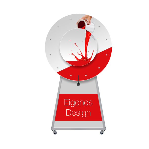 Grundkörper in exklusiver Trapezform aus eloxierten Aluminiumprofilen mit Kunststoffeinsätzen in Weiß, schwer entflammbar. Das komplette Glücksrad ist für den Innen- und Außenbereich entwickelt. Es wird kein Holz etc. verwendet und kann dadurch auch bei Regen und Outdoor eingesetzt werden. Die Beklebung der kompletten Flächen mit 4C/6C-digitalgedruckten, schutzkaschierten Aufklebern (das verwendete Schutzlamiant über dem Druck ist absolut kratzfest). Die Glücksradscheiben sind unserem Tiffany Glücksrad nach empfunden d. h. durch die vordere feststehende (Durchmesser 56 cm) und die hintere drehende Scheibe ( Durchmesser 100 cm) für einen tollen Effekt. Versteckte Befestigung der Glücksradscheibe – keine sichtbare Mittelschraube. Zwei wartungsfreie Hochleistungslager sorgen für einen sauberen Lauf der Glücksradscheibe. Hochwertig gedrehte und durch den neutralen Farbton zu jedem Layout passende Edelstahlstopper (kein Korrodieren oder Abbrechen). Innerhalb kürzester Zeit auf- und abgebaut. Das Glücksrad ist für den Transport in 3 Teile zerlegbar ( Trapezstandfuß mit Transportrollen, zwei Glücksradscheiben).