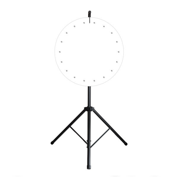 Glücksradscheibe aus 10 mm Kunststoff, weiß, Brandschutzklasse B1 (schwerentflammbar) nach DIN 4102 (D). Durchmesser 90 cm. Zwei wartungsfreie Hochleistungslager sorgen für einen sauberen Lauf der Glücksradscheibe. Hochwertig gedrehte und durch den neutralen Farbton zu jedem Layout passende Edelstahlstopper (kein Korrodieren oder Abbrechen). Höhenverstellbares 3-Bein-Stativ aus Aluminium.