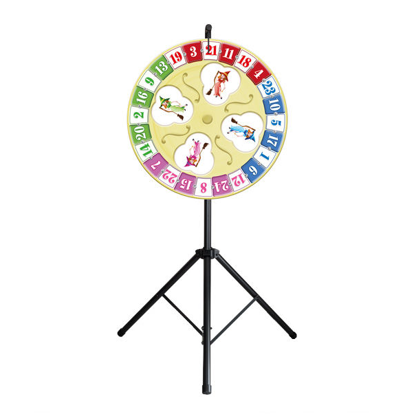Glücksradscheibe aus 10 mm Kunststoff, weiß, Durchmesser 100 cm, Brandschutzklasse B1 (schwerentflammbar) nach DIN 4102 (D). Zwei wartungsfreie Hochleistungslager sorgen für einen sauberen Lauf der Glücksradscheibe. Hochwertig gedrehte und durch den neutralen Farbton zu jedem Layout passende Edelstahlstopper (kein Korrodieren oder Abbrechen). Höhenverstellbares 3-Bein-Stativ aus Aluminium.